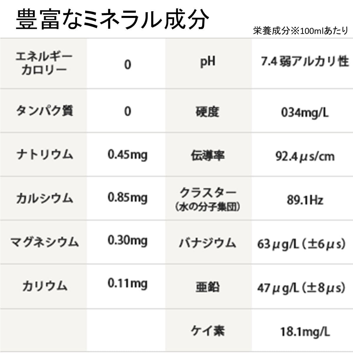 富士山麗標高1000m、地下150mから採取した、亜鉛やケイ素、バナジウムの他、約34種類のミネラルをバランス良く含んだナチュラルミネラルウォーター。